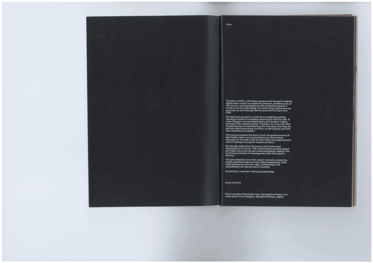 I admire what we did during my time at Arrival, so many experiments and amazingly implemented web and mobile products. I love the TakeProfit brand - it happened to be even crazier than I expected. What we did with Sasha, my fiancee for her brand After Hours. From the latest work, I would say I am proud of the FAIR project: very fresh comprehensive visual design language and product design concepts. We conducted numerous experiments, and many excellent ideas and concepts were not included in the final result. We didn't want to simply discard them, so we created a zine with the leftovers.